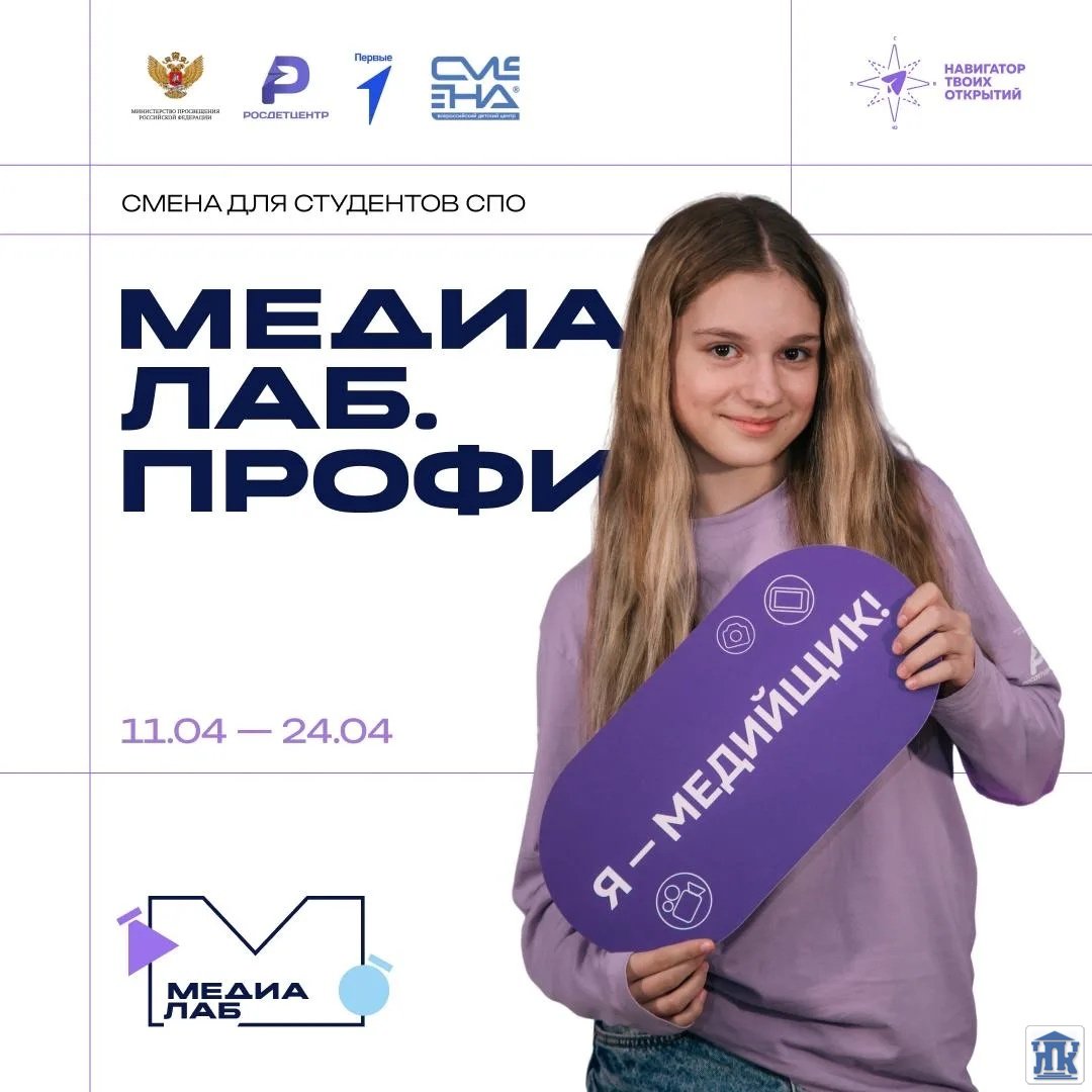 Встречаемся с 11 по 24 апреля во Всероссийском детском центре «Смена». Принять участие в программе могут студенты профессиональных образовательных организаций в возрасте от 14 до 17 лет. Будем изучать особенности медиасферы, прокачивать навыки в создании контента и работать над личным брендом. Каждый сможет попробовать себя в чём-то новом! Подать заявку можно до 25 февраля (включительно): clck.ru/3RjtWH. Подробнее в прикреплённом Положении