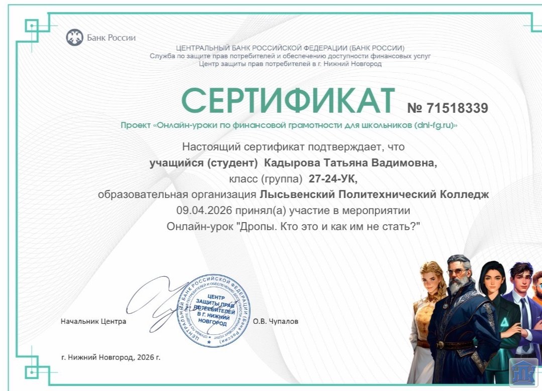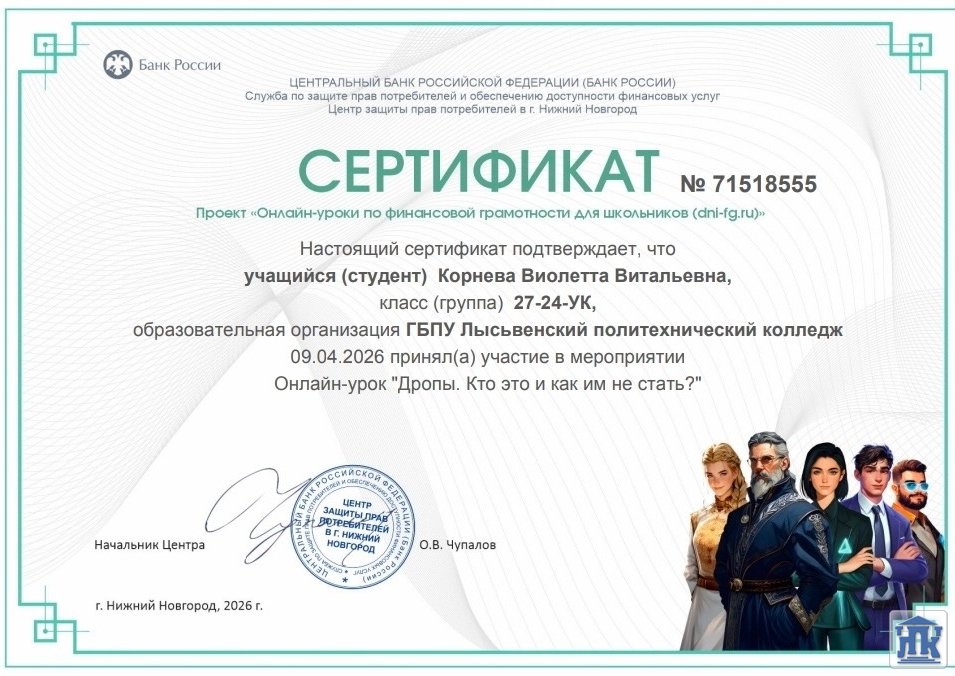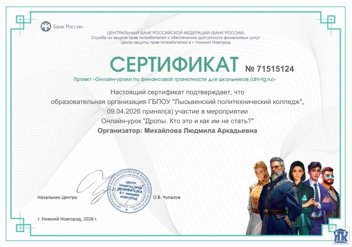 9 апреля в группах 25-24-ПД и 27-24-УК были проведены онлайн-уроки в рамках дисциплины «Основы финансовой грамотности». Мероприятие было направлено на повышение осведомлённости обучающихся о рисках, связанных с незаконными финансовыми операциями, и формирование у них устойчивых навыков безопасного финансового поведения.